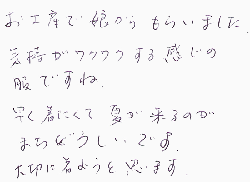 お土産で娘からもらいました。気持ちがワクワクする感じの服ですね。早く着たくて夏が来るのがまちどうしいです。大切に着ようと思います。