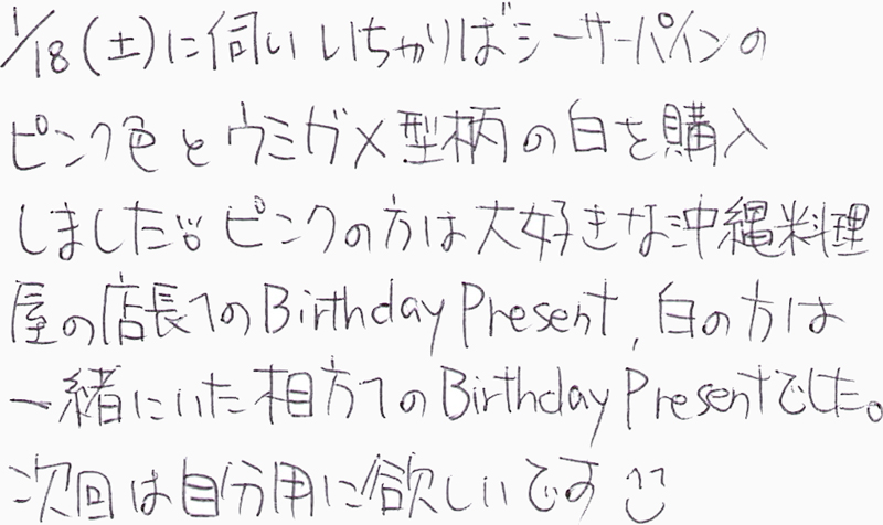 1/18(土)に伺いいちゃりばシーサーパインのピンク色とウミガメ型柄の白を購入しました。ピンクの方は大好きな沖縄料理屋の店長へのBirthdayPresent、白の方は一緒にいた相方へのBirthdayPresentでした。次は自分用に欲しいです^-^