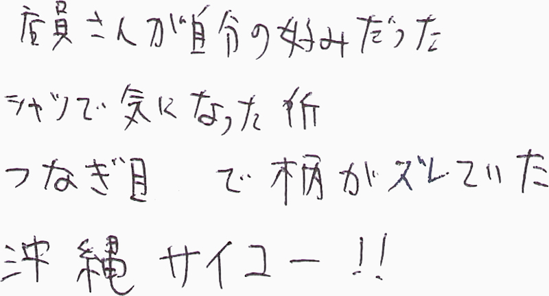 店員さんが自分の好みだった シャツで気になった所 つなぎ目で柄がズレていた 沖縄サイコー!!