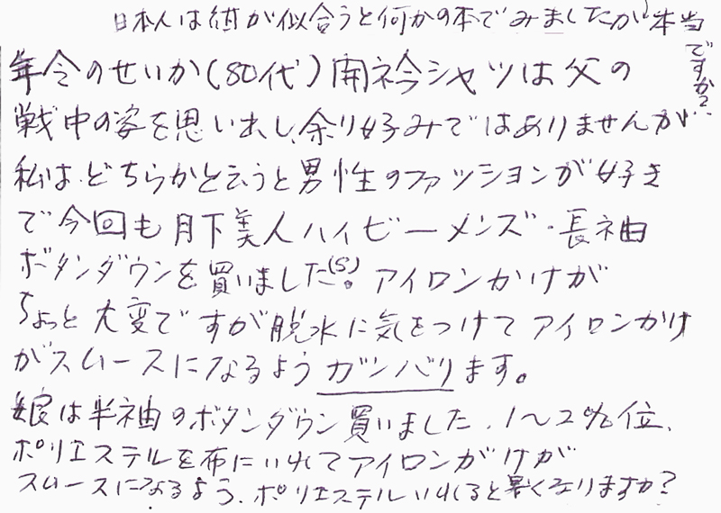 日本人は紺が似合うと何かの本でみましたが本当ですか?年令のせいか(80代)開襟シャツは父の戦中の姿を思い出し、余り好みではありませんが私はどちらかと云うと男性のファッションが好きで今回も月下美人ハイビーメンズ長袖ボタンダウン(S)を買いました。アイロンかけがちょっと大変ですが脱水に気をつけてアイロンかけがスムースになるようガンバリます。娘は半袖のボタンダウン買いました。1~2%位 ポリエステルを布にいれてアイロンがけがスムースになるようポリエステルいれると暑くなりますか?
