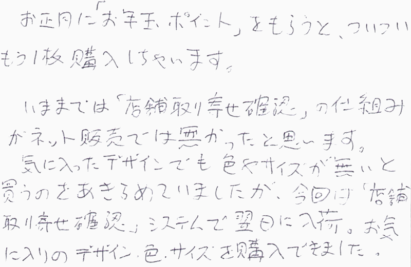 お正月に「お年玉ポイント」をもらうと、ついついもう1枚購入しちゃいます。いままでは「店舗取り寄せ確認」の仕組みがネット販売では無かったと思います。気に入ったデザインでも色やサイズが無いと買うのをあきらめていましたが、今回は「店舗取り寄せ確認」システムで翌日に入荷。お気に入りのデザイン・色・サイズを購入できました。