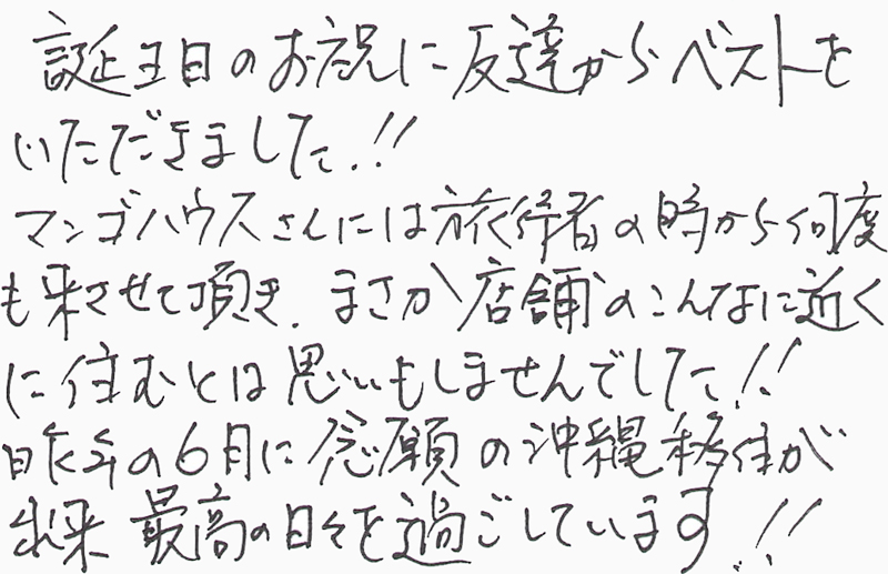 誕生日のお祝いに友達からベストをいただきました!!マンゴハウスさんには旅行者の時から何度も来させて頂き、まさか店舗のこんな近くに住むとは思いもしませんでした!!昨年の6月に念願の沖縄移住が出来 最高の日々を過ごしています!!