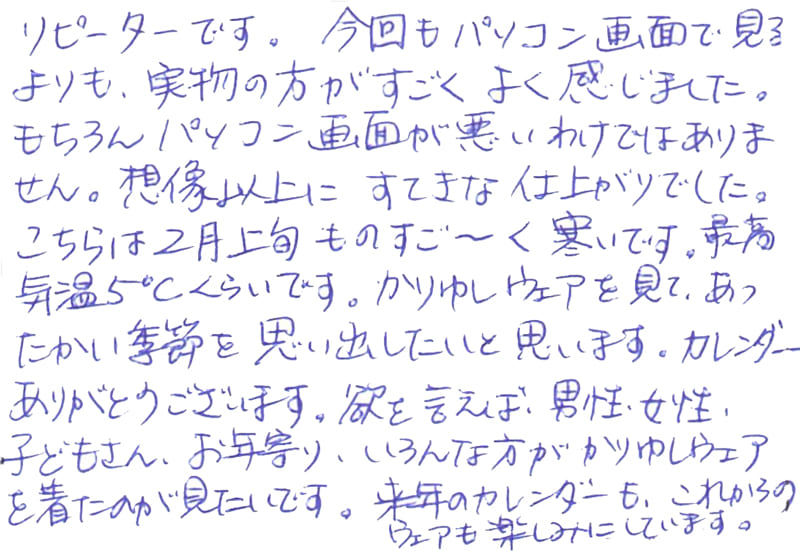 リピーターです。今回もパソコン画面で見るよりも、実物の方がすごく感じました。もちろんパソコン画面が悪いわけではありません。想像以上にすてきな仕上がりでした。こちらは2月上旬ものすご~く寒いです。最高気温5℃くらいです。かりゆしウエアを見て、あったかい季節を思い出したいと思います。カレンダーありがとうございます。欲を言えば、男性・女性・子どもさん、お年寄り、いろんな方がかりゆしウエアを着たのが見たいです。来年のカレンダーも、これからのウエアも楽しみにしています。