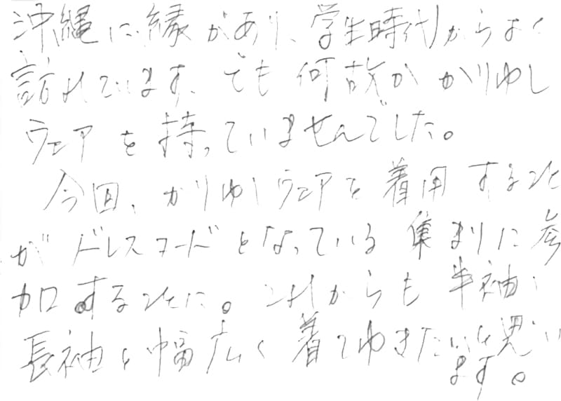 - 取引先の方がかりゆしウエアの長そでを着て来社した際、とても似あってい