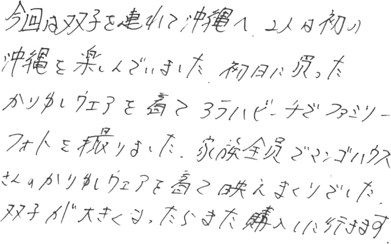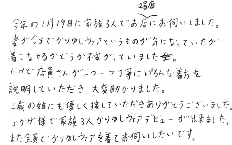 今年の1月19日に家族3人でお店(2号店)にお伺いしました。妻が今までかりゆしウエアというものが気になっていたが着こなせるかどうか不安がっていました。だけど店員さんが一つ一つ丁寧にいろんな着方を説明していただき、大変助かりました。2歳の娘にも優しく接していただきありがとうございました。おかげ様で家族3人かりゆしウエアデビューが出来ました。また全員でかりゆしウエアを着てお伺いしたいです。
