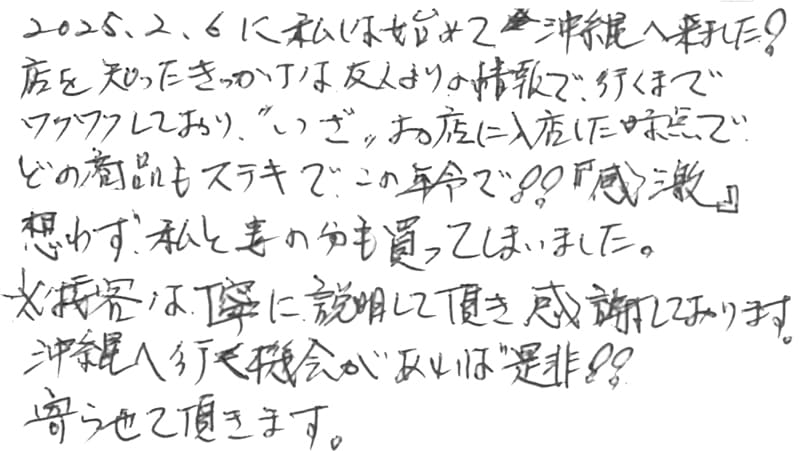 2025.2.6に私は始めて沖縄へ来ました!店を知ったきっかけは友人よりの情報で、行くまでワクワクしており、”いざ”お店に入店した時点で、どの商品もステキで、この年令で!!『感激』想わず、私と妻の分も買ってしまいました。※接客は丁寧に説明して頂き感謝しております。沖縄へ行く機会があれば是非!!寄らせて頂きます。
