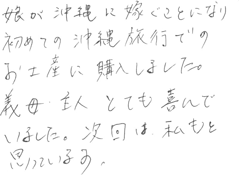 娘が沖縄に嫁ぐことになり初めての沖縄旅行でのお土産に購入しました。義母・主人ともに喜んでいました。次回は私もと思っています。