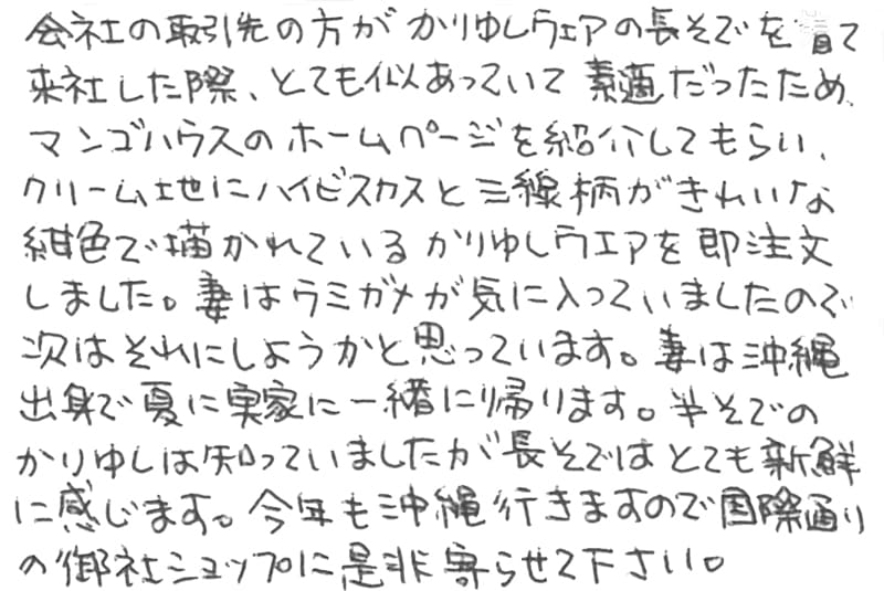 会社の取引先の方がかりゆしウエアの長そでを着て来社した際、とても似あっていて素敵だったため、マンゴハウスのホームページを紹介してもらい、クリーム地にハイビスカスと三線柄がきれいな紺色で描かれているかりゆしウエアを即注文しました。妻はウミガメが気に入っていましたので次はそれにしようかと思っています。妻は沖縄出身で夏に実家に一緒に帰ります。半そでのかりゆしは知っていましたが長そではとても新鮮に感じます。今年も沖縄行きますので国際通りの御社ショップに是非寄らせて下さい。