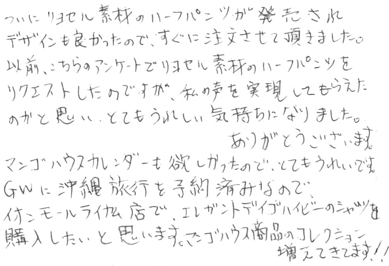 ついにリヨセル素材のハーフパンツが発売されデザインも良かったので、すぐに注文させて頂きました。以前、こちらのアンケートでリヨセル素材のハーフパンツをリクエストしたのですが、私の声を実現してもらえたのかと思い、とてもうれしい気持ちになりました。ありがとうございます。マンゴハウスカレンダーも欲しかったので、とてもうれしいです。GWに沖縄旅行を予約済みなので、イオンモールライカム店で、エレガントデイゴハイビーのシャツを購入したいと思います。マンゴハウス商品のコレクション増えてきてます!!