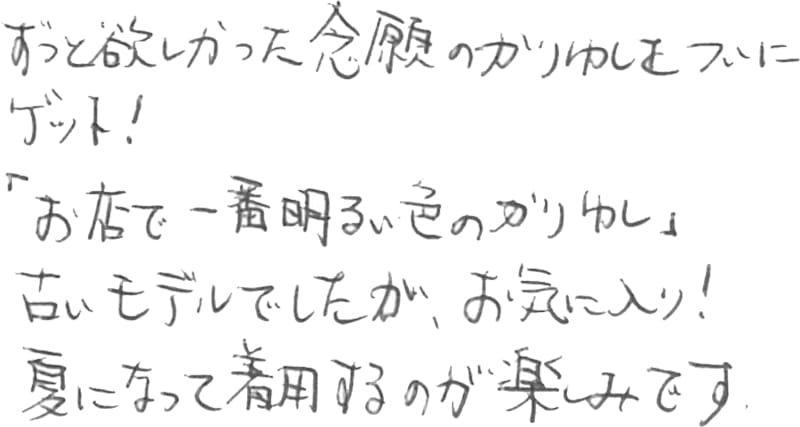 ずっと欲しかった念願のかりゆしをついにゲット!「お店で一番明るい色のかりゆし」古いモデルでしたが、お気に入り!夏になって着用するのが楽しみです。