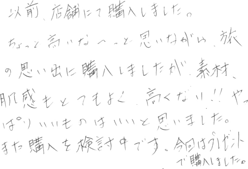 以前、店舗にて購入しました。ちょっと高いな~っと思いながら、旅の思い出に購入しましたが、素材、肌感もとてもよく、高くない!!やっぱりいいものはいいと思いました。また購入を検討中です。今回はプレゼントで購入しました。