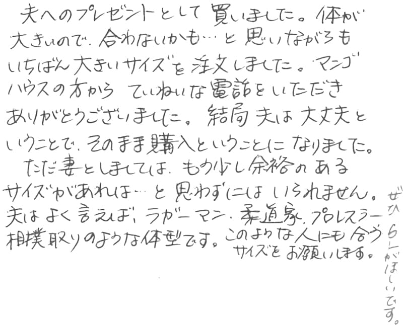 夫へのプレゼントとして買いました。体が大きいので、合わないかも・・・と思いながらもいちばん大きいサイズを注文しました。マンゴハウスの方からていねいな電話をいただきありがとうございました。結局夫は大丈夫ということで、そのまま購入ということになりました。ただ妻としましては、もう少し余裕のあるサイズがあれば・・・と思わずにはいられません。夫はよく言えば、ラガーマン・柔道家・プロレスラー相撲取りのような体型です。このような人にも合うサイズをお願いします。ぜひ6Lがほしいです。