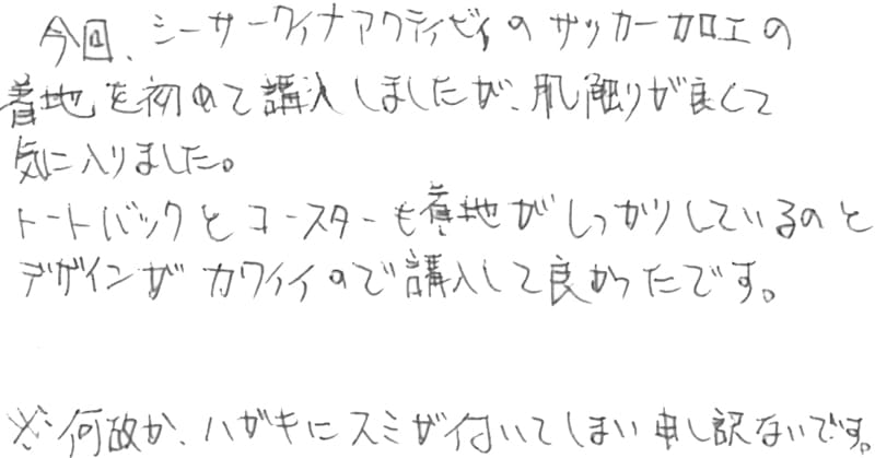 今回、シーサークイナアクティビティのサッカー加工の着地を初めて購入しましたが、肌触りが良くて気に入りました。トートバックとコースターも着地がしっかりしているのとデザインがカワイイので購入して良かったです。