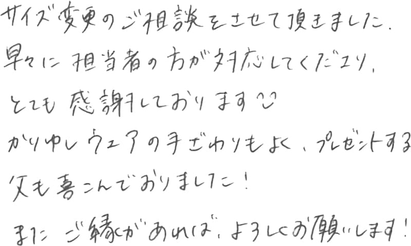 サイズ変更のご相談をさせて頂きました。早々に担当者の方が対応してくださり、とても感謝しております^-^かりゆしウエアの手ざわりもよく、プレゼントする父も喜んでおりました!またご縁があれば、よろしくお願いします!