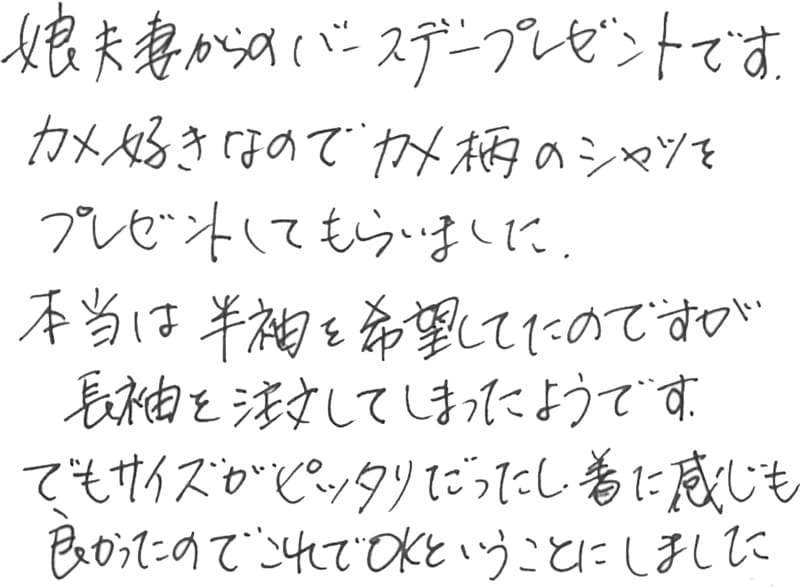娘夫婦からのバースデープレゼントです。カメ好きなのでカメ柄のシャツをプレゼントしてもらいました。本当は半袖を希望してたのですが長袖を注文してしまったよです。でもサイズがピッタリだったし、着た感じも良かったのでこれでOKということにしました。