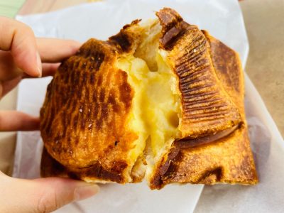 ふわぁ~お♡♡生地はなんとサクサク、パイやクロワッサンに似た食感。こぼれる欠片一片だけでも甘さと癒し感じる生地に、たっぷりのカスタード。カスタード&カスタード。甘く温かいカスタードが、口に入れた瞬間足先から脳天までかけめぐる!!