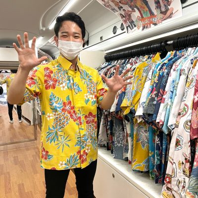 いつものお客様も♪お、今日はかりゆしウェア【クロトン大柄】ですね~?お急ぎのようですがライカム店にもお越しくださいましてありがとうございます。