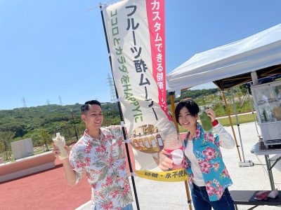 こちらのにこにこ癒し顔のお兄さん。「HAPPY PEARL」さんのフルーツ酢ムージー!!声をかけて頂きましてすっかりフルーツ酢ムージーのトリコになった2人。