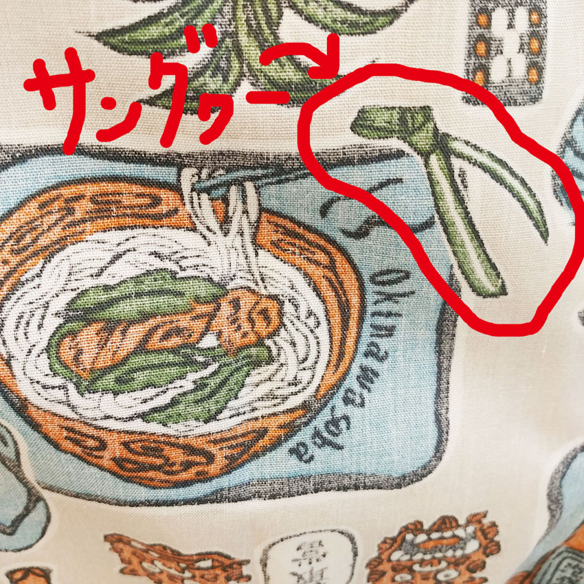 沖縄そばの斜め上にちょこんと付いてるサングヮー(ご先祖様に食べ物をお供えするときに添えるお守りみたいなもの)