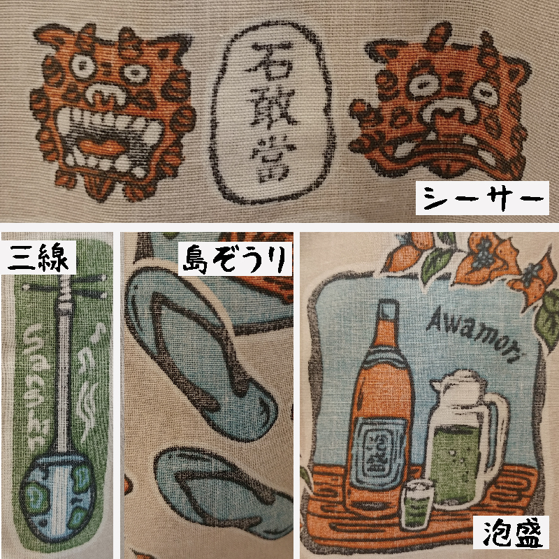 ハイビスカスやシーサー、ヤンバルクイナやウミガメなどなど。