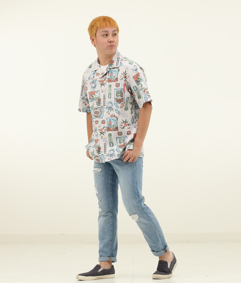パンツはジーンズで合わせて、シンプルに着こなせてアロハシャツを引き立たせてくれます。