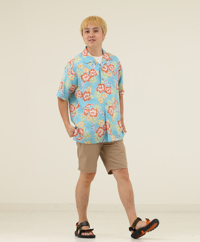 爽やかで涼しく見えるライトブルーパンツはシンプルにチノパンを着れば、 初心者でも簡単にアロハシャツを楽しめます!!