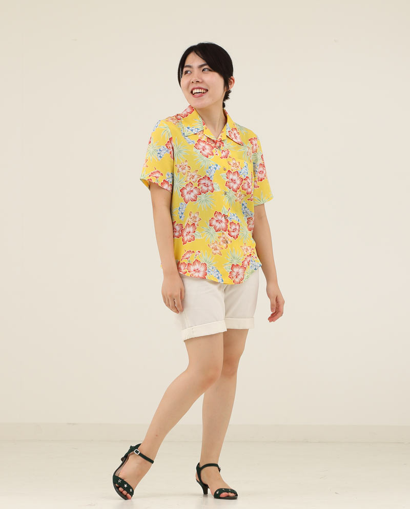 レディースはイエローに白の短パンを着て、女性らしくカジュアルにアロハを楽しめます!!