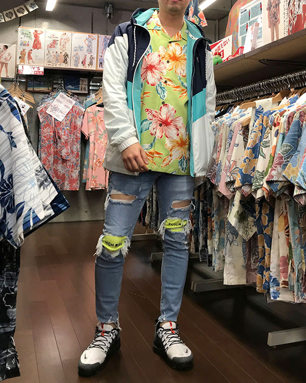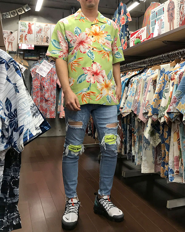 大胆なタッチのハイビスカス柄のかりゆしウェア!!かりゆしウェアスタッフコーデ(^^♪