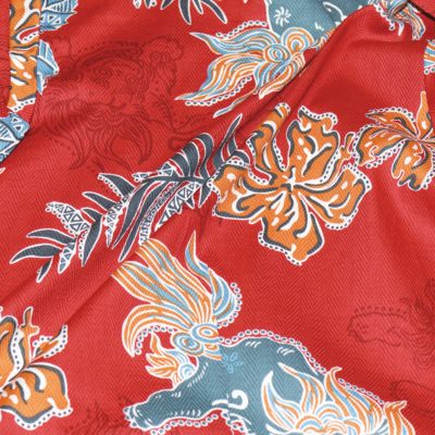南国の花々の中でシーサーが駆けまわってる様子を描いた、鮮やかな発色が印象的なシャツになってます♪