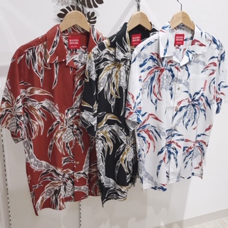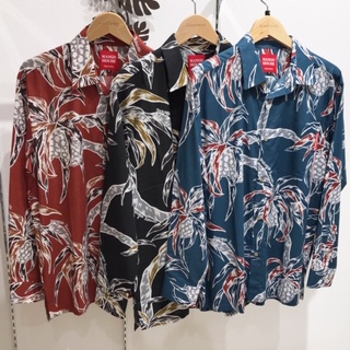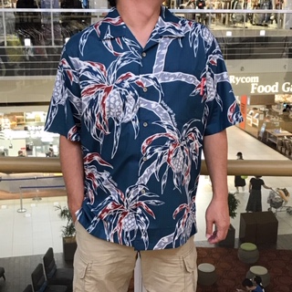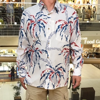 沖縄の海辺ではおなじみのアダンを、油絵のような大胆なタッチで迫力いっぱいに描かれたかりゆしウェアです