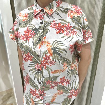 そのプルメリアのオレンジ色が印象的なオススメかりゆしウェアがこちら→【プルメリアガーデン カシュクールシャツ】