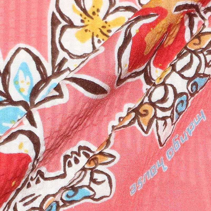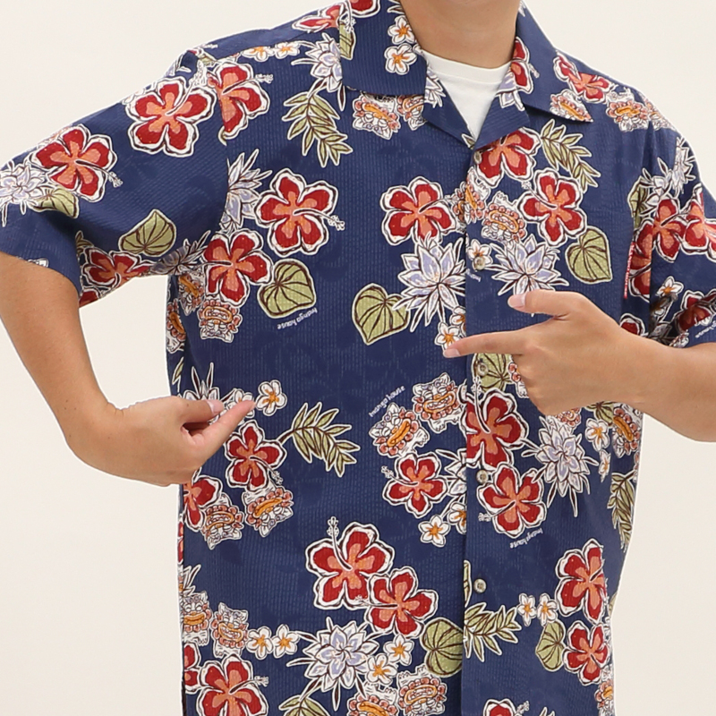 生地に特殊な加工(サッカー加工)が施されていて、ハイビスカスとヤシの木のデザインが生地に織られています!!