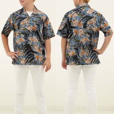 大きなヤシの葉の中に今にも動きそうなシーサー達を和風に描いた。斬新で粋な沖縄のアロハシャツ。
