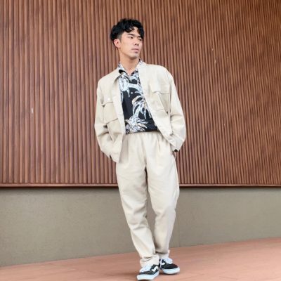 セットアップとしてだけでもお洒落なコーデですが、そこにかりゆしウェア合わせると