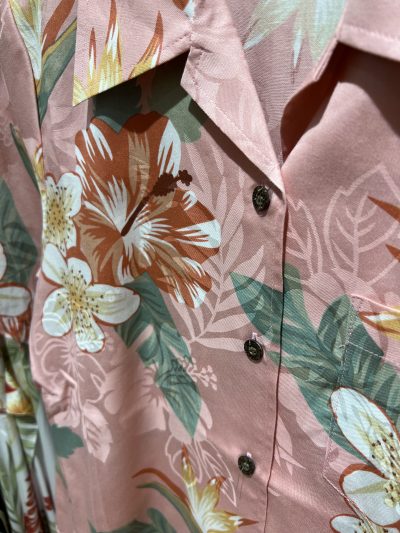 淡いピンク色で優雅な雰囲気が魅力のかりゆしウェアです。