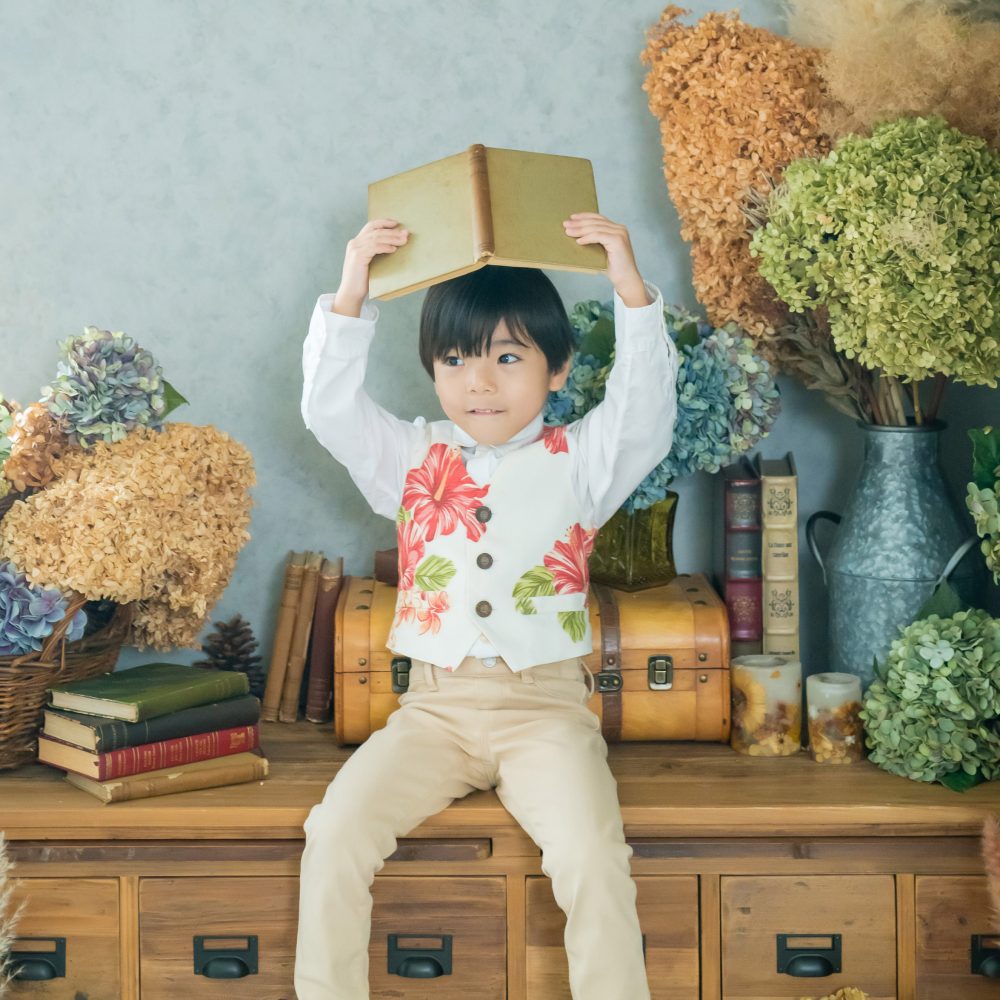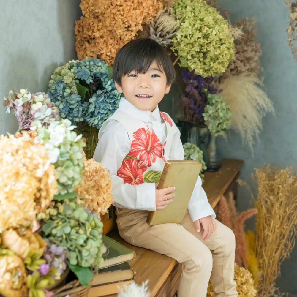 最近のスタジオは、ドライフラワーがあったり、ほんわかした雰囲気が多いので、そこのスタジオのイメージに合わせると、かりゆしウェアでもこんなに素敵な写真に仕上がります♪