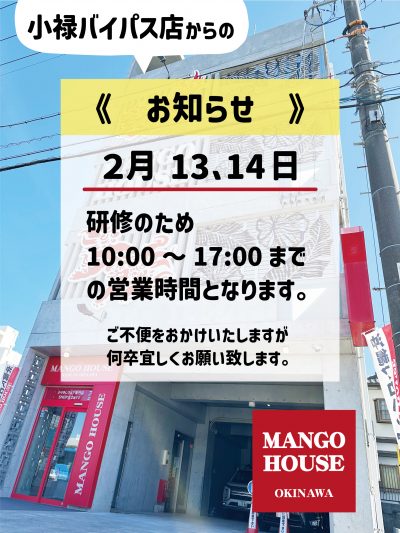 【小禄バイパス店】2月13~14日の営業時間変更のお知らせ