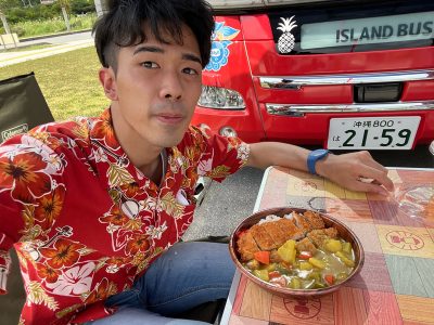 アイランド号staff結構お世話になっております。。。キッチンカーというか動く定食屋といっても過言じゃないような。ケースケはタコライス(かな?)、カミサトはカツカレーを頂きます。