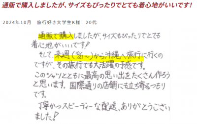 通販で購入しましたが、サイズもぴったりでとても着心地がいいです!そして、来週(10/21~)から沖縄へ旅行に行くのですが、その旅行でも大活躍の予感です。