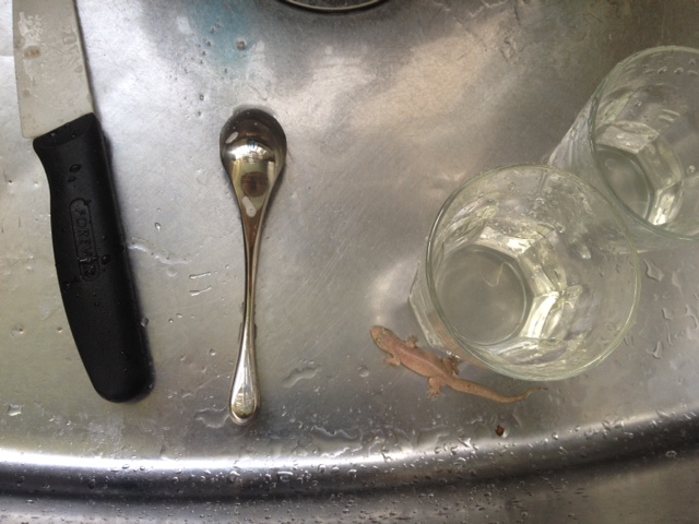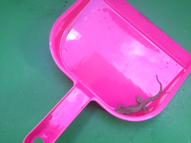 ヤモリが自宅のシンクででられなくなっていたので、ミニちりとりを仕掛けて、その上でまんまとくつろぎ始めたところで外に出してあげました。