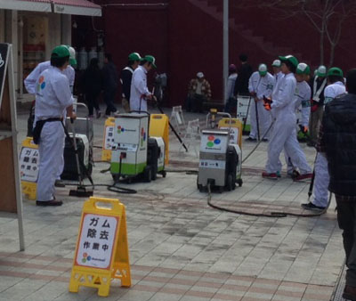 この前平和通りを歩いていると、地面にこべり付いたガムを除去している団体がいたんですよ。