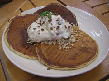 <クルミとホイップを添えた 黒糖味のパンケーキ>