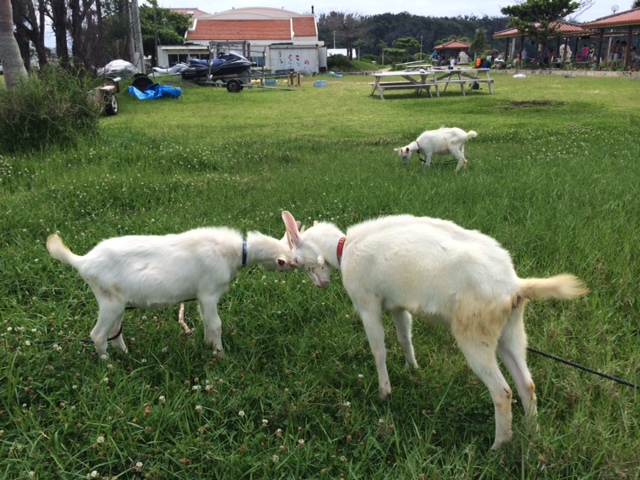 よくわからないでいるとこの子、近くにいるヤギにも頭突きしにいきました。