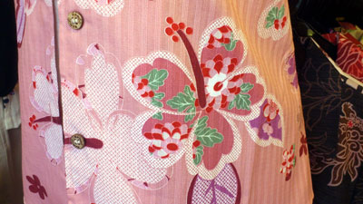 南国らしいハイビスカスがモチーフに描かれており、浴衣のような和柄のデザインに