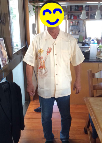 プレゼントしたのは【エイサーパネル】です。大胆な柄の配置が印象的なシャツです♪