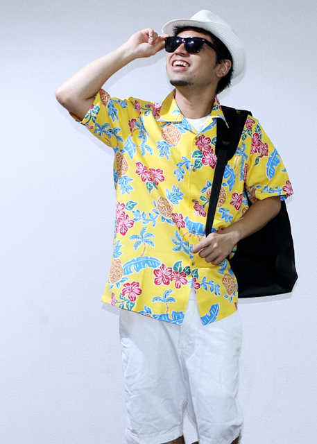 沖縄らしい元気なトロピカル柄かりゆしウェアなので
