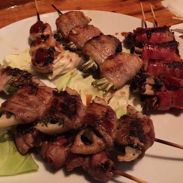 野菜を中心にカキやチーズ、バナナに豚バラを巻いたやつ