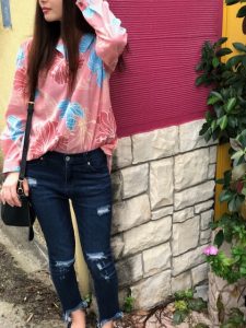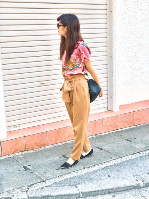 トロピカルな柄ですが黒を合わせると抑えめな印象
