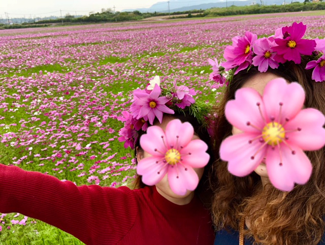 稲作地帯でコスモスが見られるのはこの時期のみ。稲の緑肥のためコスモスの種が年末にまかれて、今の時期満開に!