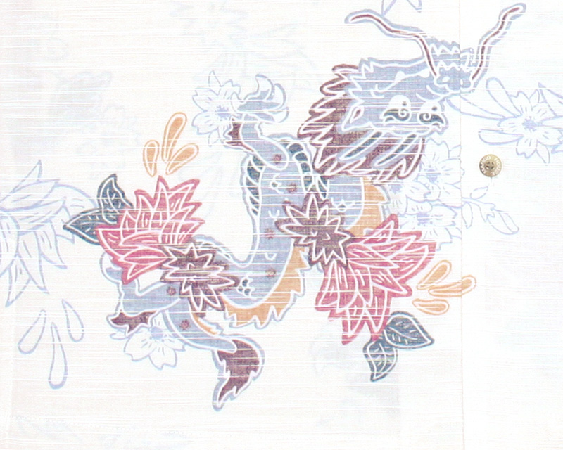 友達が着ている柄がボタンダウンタイプの「紅型ドラゴン(裏地仕様)」